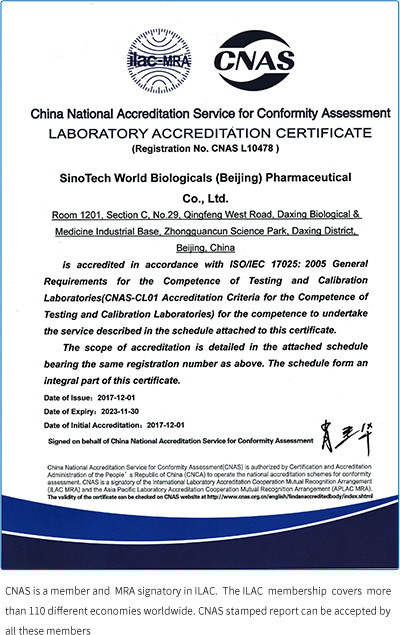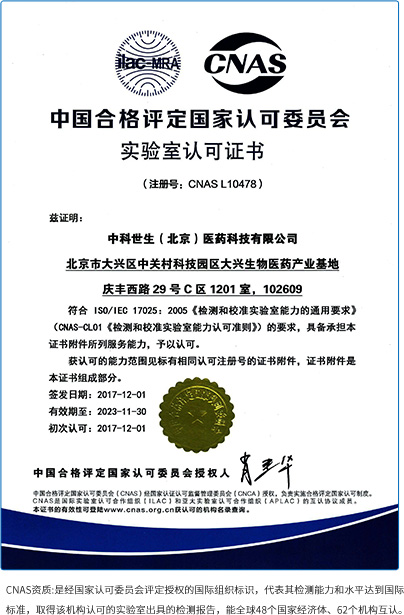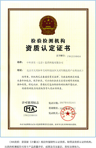 中科(kē)世生(shēng)建有(yǒu)完善的(de)與國(guó)際接軌的(de)質量管控體(tǐ)系。2017年(nián)5月(yuè)獲北(běi)京市(shì)質♦量技(jì)術(shù)監督局CMA認證授權、9月(yuè)獲歐盟(EURM)實驗能(néng)力認可(kě)、12月(yuè)獲中國(guó)合格評定國(guó)家(jiā)認可(kě)委員(yuán)會(huì)CNAS認證,這(zhè)是(shì)目前國(guó)內(nèi)在病毒檢測$、滅活、去(qù)除工(gōng)藝驗證領域獲得(de)“三認證”授權的(de)專業(yè)技(jì)術(shù)服務企©業(yè)。2018年(nián)中科(kē)世生(shēng)為(wèi)用(yòng)戶提交的(de)英文(wén)版檢測報(bàβo)告已被美(měi)國(guó)FDA認可(kě)并取得(de)注冊證書(shū)。