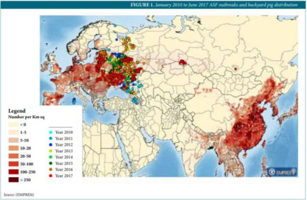 圖為(wèi)2010年(nián)1月(yuè)至2017年(nián)6月(yuè)非洲豬瘟爆發的(de)區(qū)域