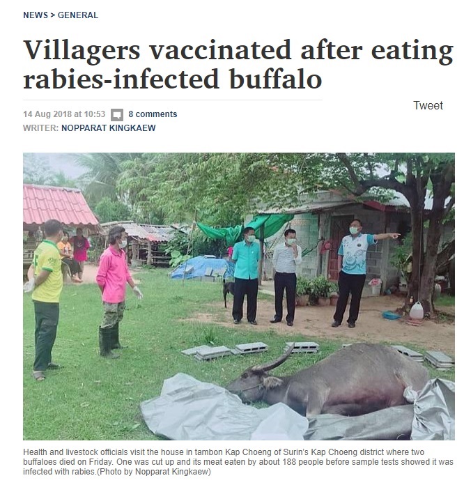 據曼谷郵報(bào)(Bangkok Post)報(bào)導,本月(yuè)中旬,泰國(guó)素辇府鴿沖縣的(de)一(yī)個(gè)村( cūn)莊發生(shēng)了(le)一(yī)起誤食狂犬病發作(zuò)死亡水(shuǐ)牛的(de)公共衛生(shēng)事(shì)件(jiàn)。